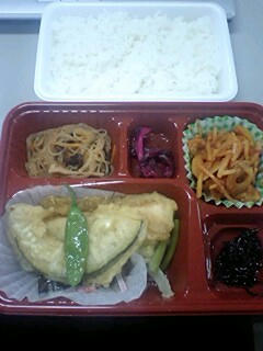 8月26日の昼食です。今日は仕出し弁当450円 かぼちゃ天 イカ天付きです